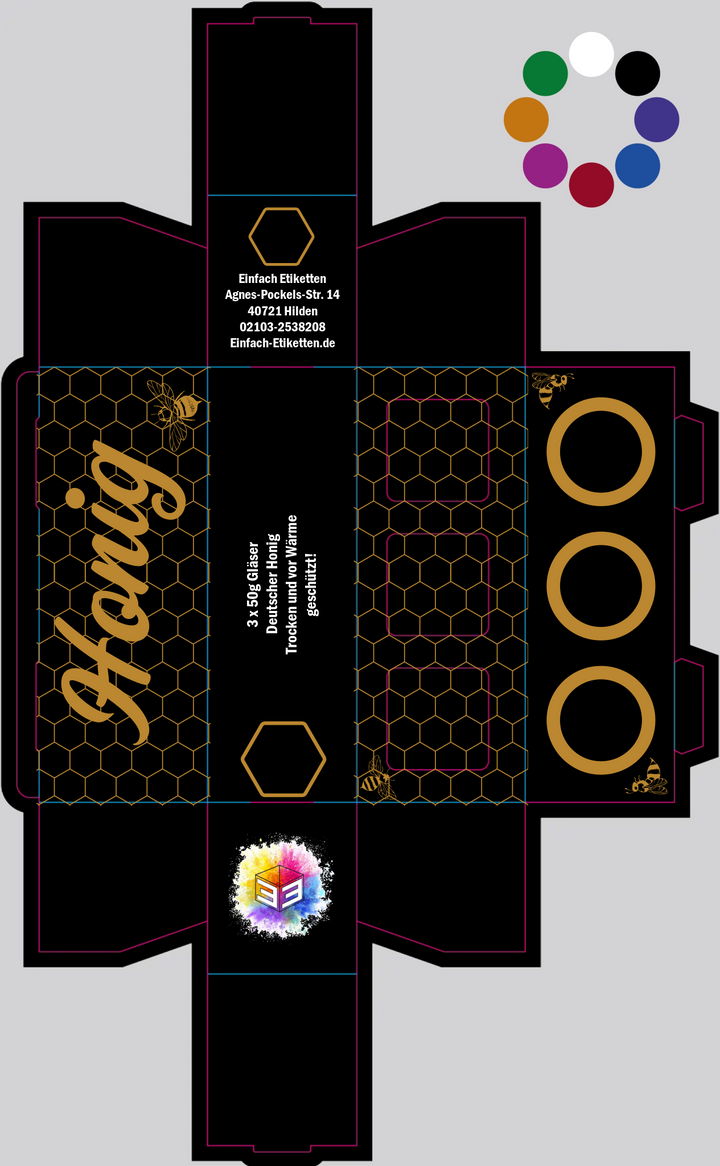 Drei edle Gläser verdienen eine ebenso schöne Verpackung! Diese luxuriöse 3er Umkarton-Lösung für 50g Gläser besticht durch ihren raffinierten Golddruck und lässt sich ganz nach deinem Geschmack gestalten – wähle einfach deinen Lieblingshintergrund. Perfekt als Geschenkverpackung, die garantiert Eindruck macht. Die verbesserte Verpackungseinheit sorgt für sicheren Transport und professionelle Präsentation. Verwöhne deine Kunden mit diesem glänzenden Unboxing-Erlebnis!