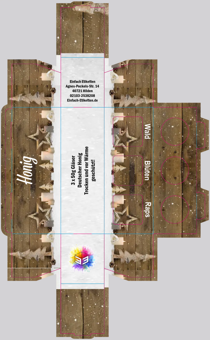 Weihnachtliche Freude in einer Box! Diese festliche 3er Umverpackung mit authentischer Holzfassade bietet Platz für drei 50g Gläser und lädt zum Kombinieren ein – stelle dir deine Traumkombination zusammen. Personalisiere die Verpackung mit deinen eigenen Daten und schaffe ein einzigartiges Geschenk. Die praktische Verpackungseinheit ist perfekt zum Verschenken und hinterlässt bei jedem Beschenkten einen bleibenden Eindruck. Rustikal, liebevoll gestaltet und voller weihnachtlichem Charme – das ideale Präsent für alle, die Qualität und Kreativität schätzen!