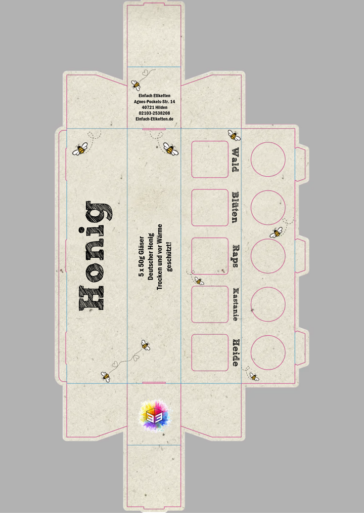 Perfekte Verpackung für drei 50g Gläser – diese rustikale Geschenkbox besticht durch ihr verspieltes Design mit Comic-Biene. Ideal zum Verschenken oder als ansprechende Verkaufseinheit. Die robuste Verpackung schützt Ihre Produkte zuverlässig und macht gleichzeitig eine großartige Figur im Regal. Charmant, praktisch und sofort einsatzbereit.
