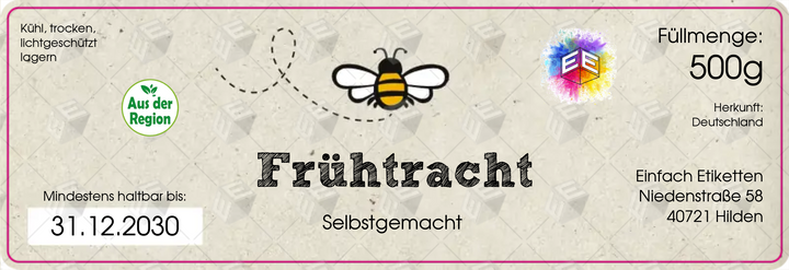 Dein Honig verdient ein Etikett, das genauso süß ist wie sein Inhalt! Mit der niedlichen Comicbiene wird dein Glas zum echten Hingucker. Personalisiere Herkunft, Sorte und spezielle Details ganz nach deinen Wünschen. Das praktische Rechteckformat sitzt perfekt auf dem Glas und lässt Platz für einen individuellen Deckel – und spart dir dabei noch Kosten, weil du mehr Etiketten pro Bogen bekommst. Dein eigenes Meisterwerk! Das Etikett passt perfekt auf ein 220ml (66mm Twist off Mündung), 418ml (82mm Twist off Mündung) Glas oder 250ml Flasche (28mm Twist off Mündung). 10 Etiketten passen auf einen Bogen.